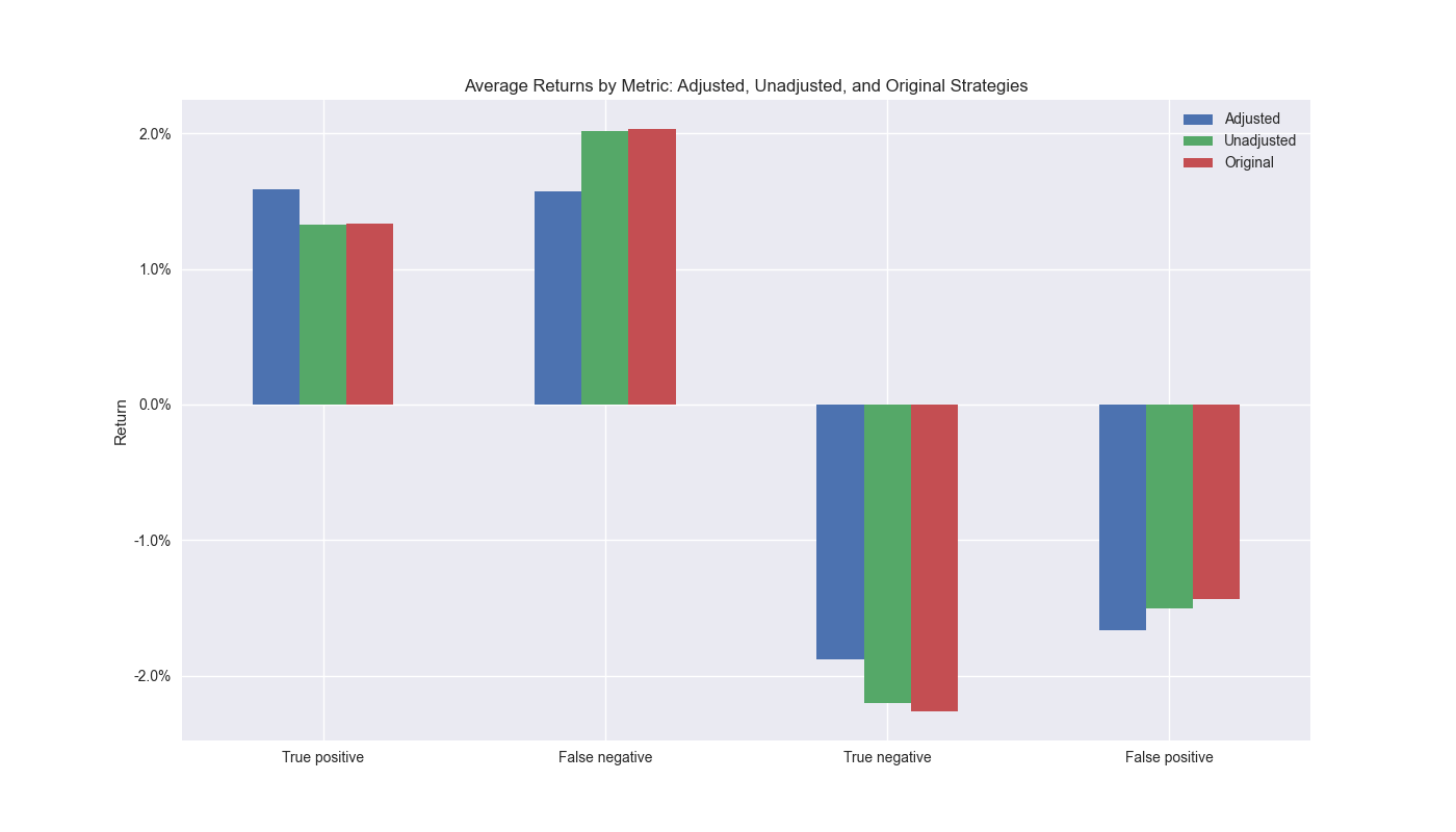 plt.title('Average Returns by Metric: Adjusted, Unadjusted, and Original Strategies')